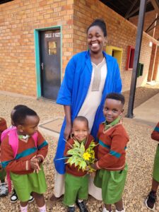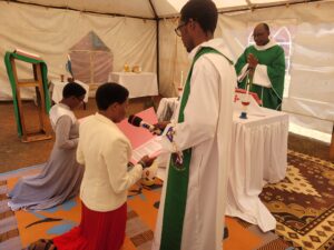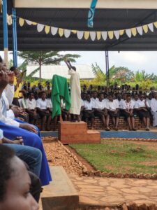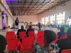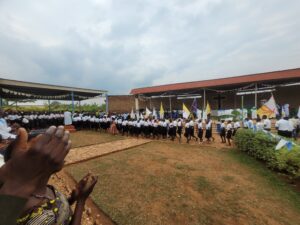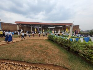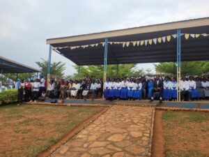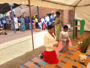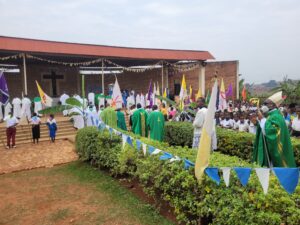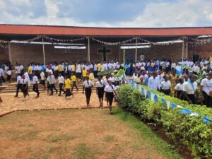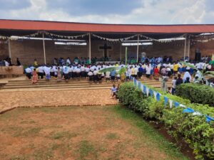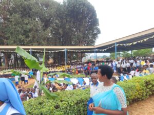 Le dimanche de mon anniversaire, c’était l’ouverture de l’année pastorale diocésaine avec l’évêque. Tous les enseignants des établissements catholiques, catéchistes, élèves à partir de 7 ou 8 ans je crois étaient là. J’ai eu la joie de voir venir Louange qui voulait me saluer, le sourire jusqu’au oreilles ! Louange est une enfant de Nyabututsi qui était venue pour chacun des 2 étés des enfants avec sa soeur Joyeuse et son frère Joyeux Noël.