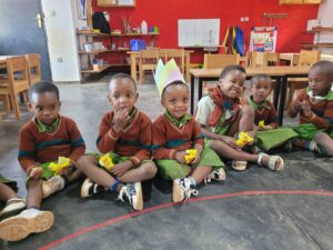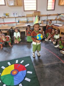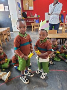 Nous faisions une photo pour l’envoyer à la maman car je suis la maitresse de Ethan. (en orange et de Théo tout à gauche)